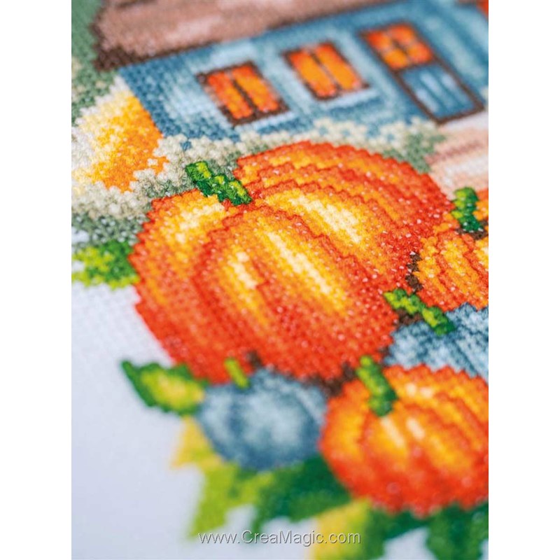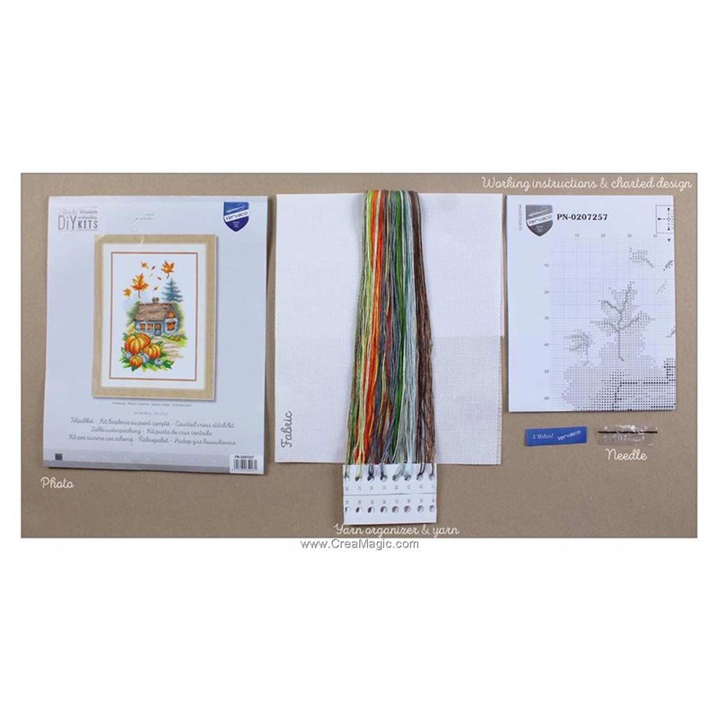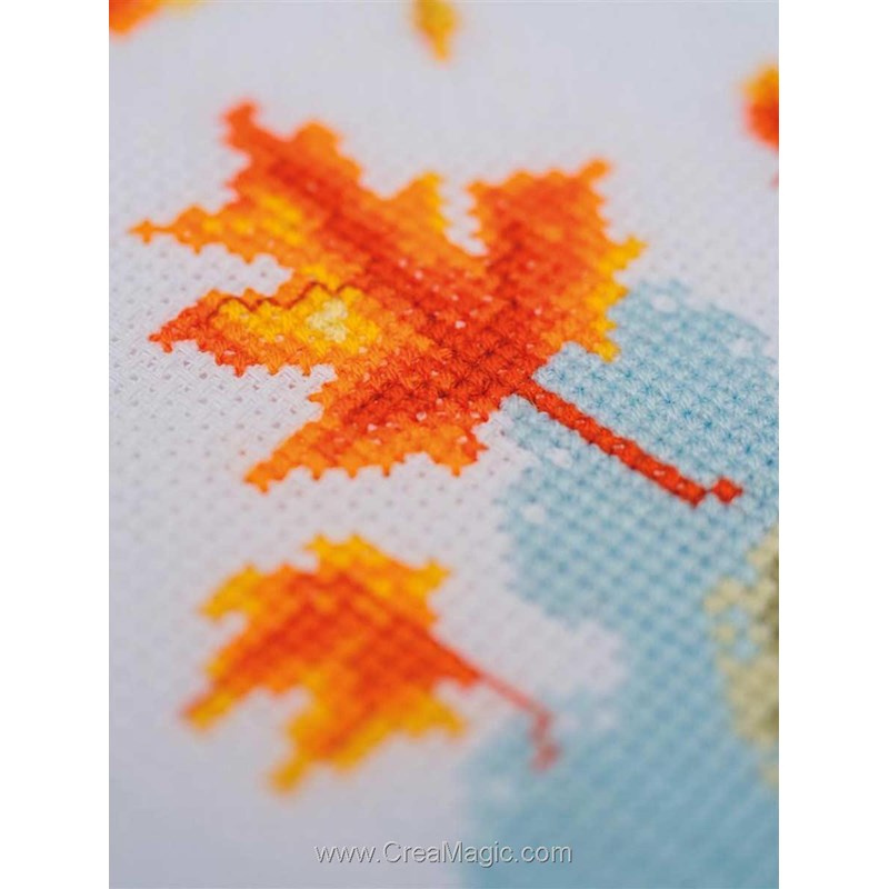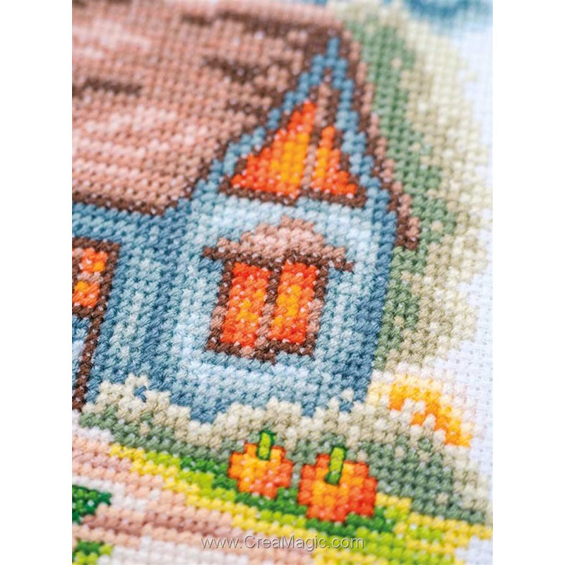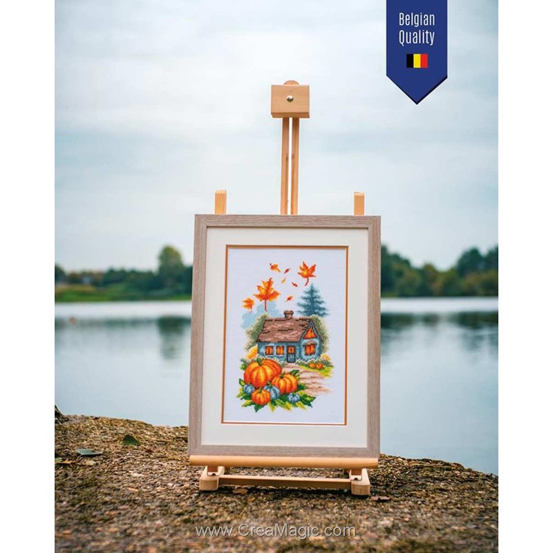 Une maison paisible entourée de feuillages aux couleurs chaudes devient le cœur de ce kit de broderie au point compté. La scène évoque l’automne dans toute sa douceur, avec une atmosphère chaleureuse et accueillante, idéale pour créer une broderie décorative à l’esprit cosy et saisonnier.