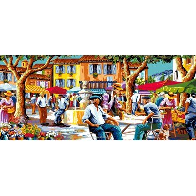 - Motif : marché provençal, fontaine, villageois et maisons colorées