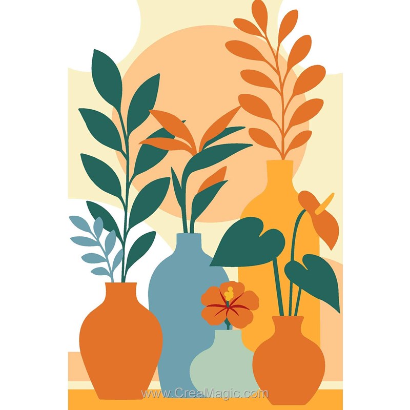 Ce modèle est idéal pour celles et ceux qui aiment les compositions décoratives faciles à intégrer dans un intérieur moderne. Son motif végétal associé aux poteries lui donne une allure à la fois douce, tendance et intemporelle. C’est un excellent choix pour réaliser un canevas élégant, avec un rendu visuel harmonieux et plein de personnalité.