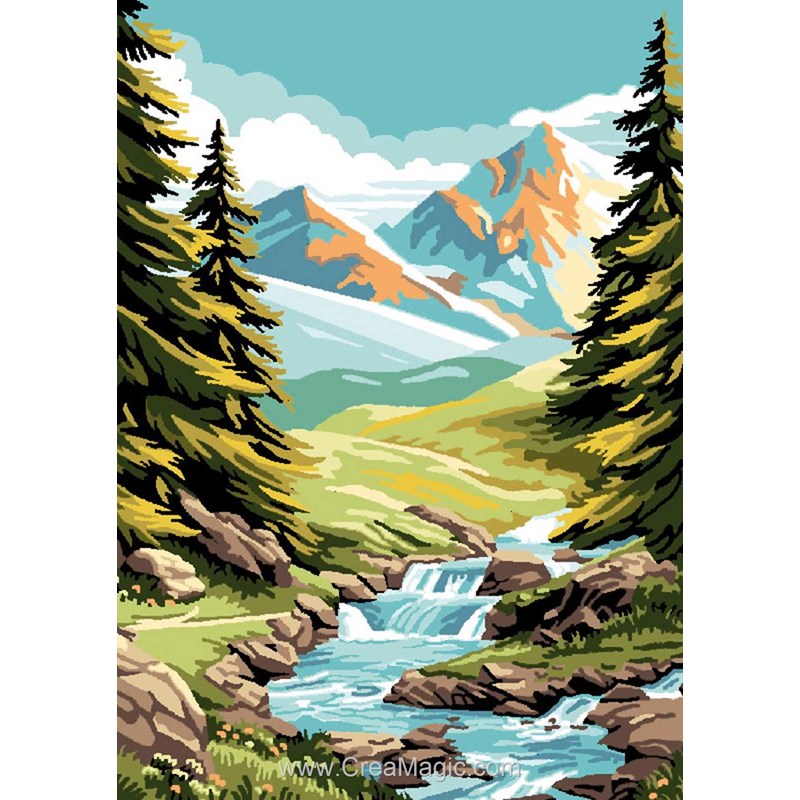 Motif : torrent de montagne dans un paysage alpin avec sapins et sommets Dimensions du dessin : env. 25 × 35 cm Dimensions de la toile : 32 × 50 cm Technique : canevas à réaliser selon la technique de votre choix adaptée au support Toile : canevas Antique imprimé Marque : MimoVerdé