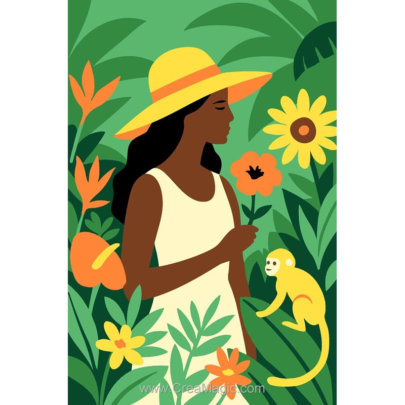 Une fois terminé, ce canevas devient une création décorative lumineuse et pleine de charme. Les feuillages, les fleurs et la silhouette féminine composent un ensemble vivant et équilibré, parfait pour apporter à votre décoration une note exotique, naturelle et ensoleillée.