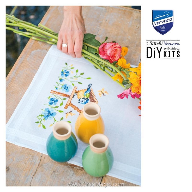 Kit chemin de table imprimé Vervaco les nichoirs des mésanges à broder en broderie traditionnelle