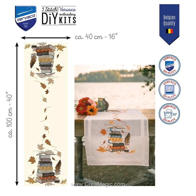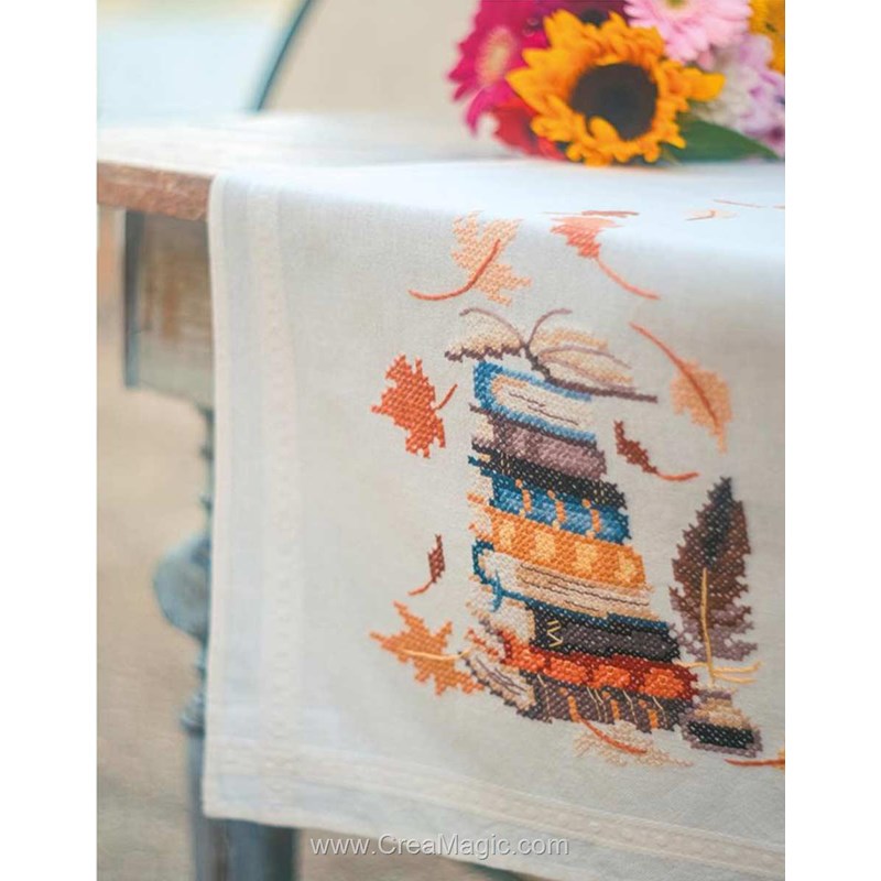 Kit Chemin De Table Broderie Point de Croix imprimée - Livres et feuilles d'automne - Vervaco