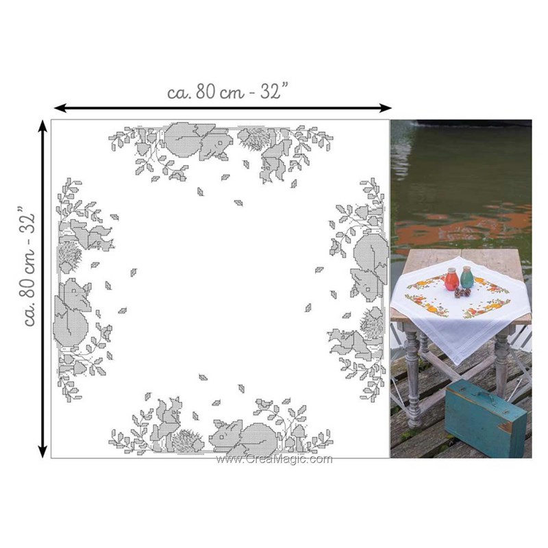 Apportez une ambiance chaleureuse et conviviale à votre table avec cette nappe à broder représentant des animaux d’automne. Le motif met en scène la faune de la forêt entourée de feuillages aux couleurs de saison, créant une décoration douce et naturelle, idéale pour les repas d’automne et les moments partagés en famille.