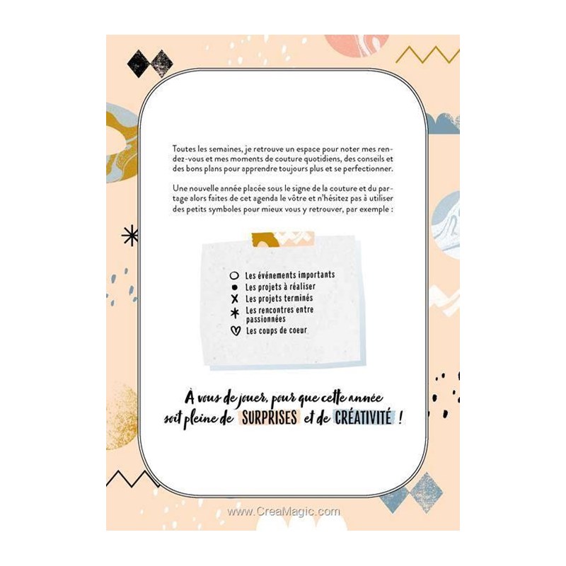 365 jours de couture avec votre agenda 2021 ! Voici votre nouveau compagnon, pensé par une couturière, qui distillerades conseils tout au long de l’année pour vous inspirer, vous apprendrede nouvelles techniques et vous transmettre des infos étonnantes. Mon agenda couture, c’est… - Des semaines sur une double page pour visualiser tous vos rendez-vous en un coup d’œil, avec des astuces et conseils couture. - Un focus thématique tous les mois qui vous permet d’approfondir une thématique. - Un agenda feel good pour vous apporter du bonheur au quotidien !